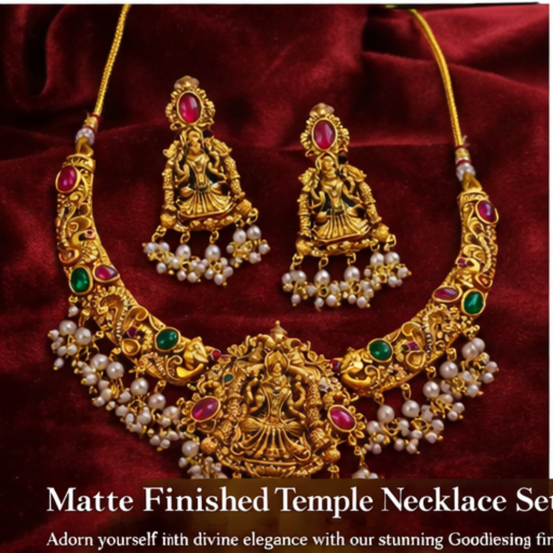 Celebrate tradition with timeless elegance through this exquisite Temple Design Matte Finish Necklace Set. Inspired by classical South Indian temple artistry, this masterpiece features intricate goddess motifs, antique gold detailing, and rich ruby-green stone embellishments.