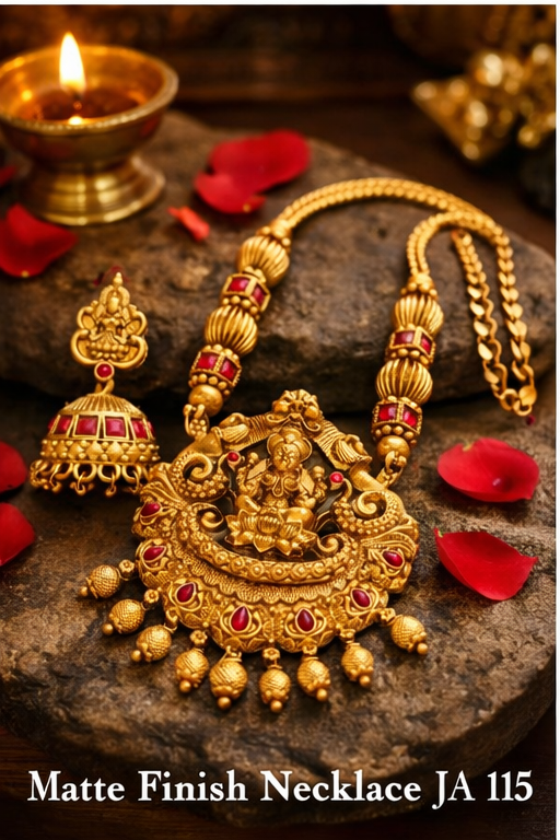 Elevate your traditional look with the timeless elegance of our Syamanthakam Matte Finish Necklace Set. Inspired by classic South Indian temple jewelry, this exquisite set features a beautifully crafted Goddess Lakshmi motif pendant, symbolizing prosperity and divine grace.