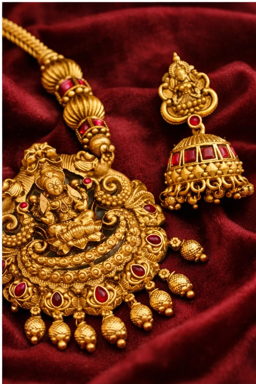 Designed with intricate detailing, antique matte gold finish, and rich ruby-toned stone embellishments, this statement piece blends heritage craftsmanship with royal sophistication.