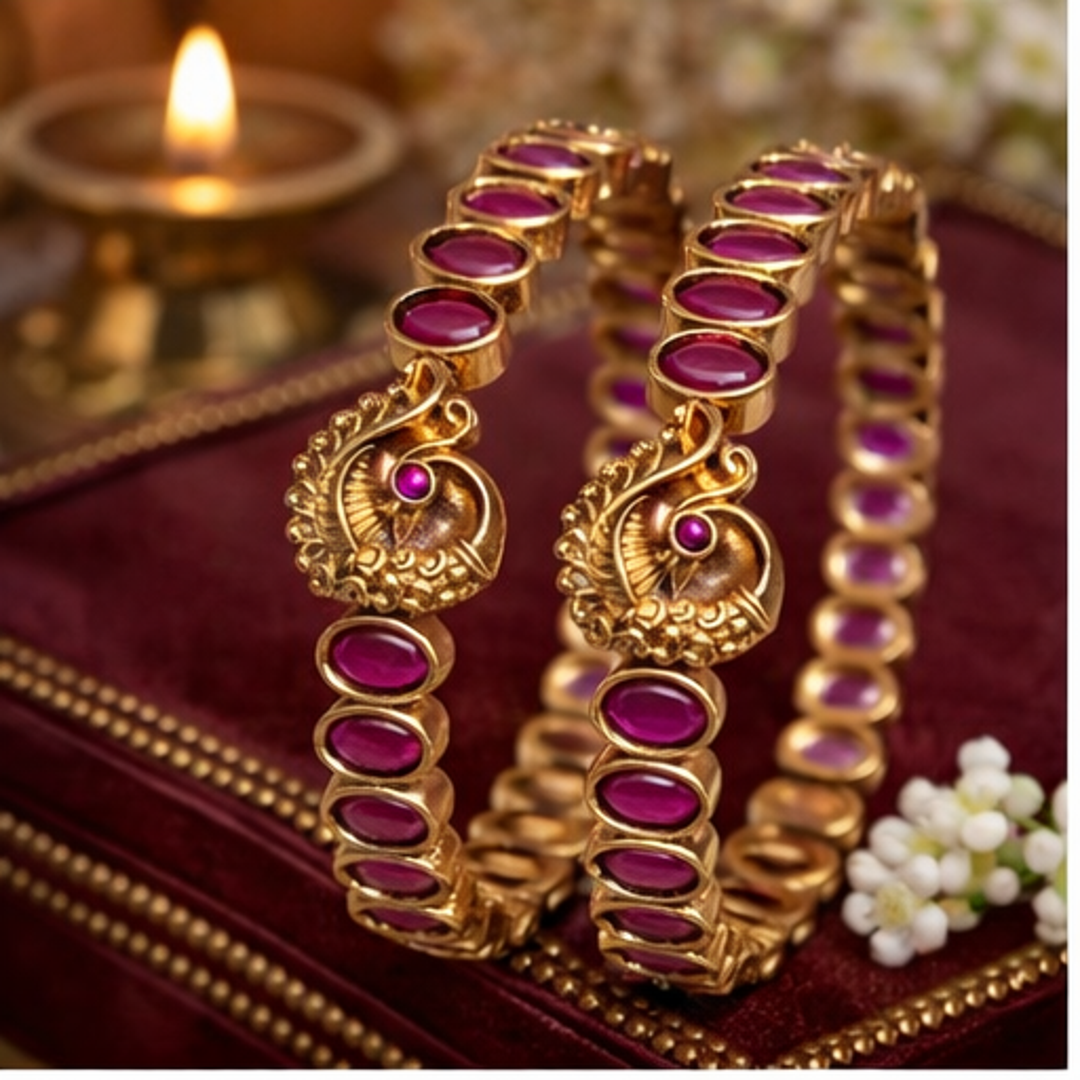 Grace your wrists with timeless elegance through these stunning peacock ruby designer bangles, crafted in a radiant antique gold finish. Featuring a continuous line of rich ruby-toned oval stones, the design is beautifully highlighted with an intricately carved peacock motif at the center, symbolizing grace and prosperity. The detailed craftsmanship and balanced structure create a refined yet bold statement, making these bangles perfect for weddings, festive occasions, and traditional celebrations. Pair them with silk sarees or bridal ensembles to add a touch of royal charm and heritage sophistication to your look.
