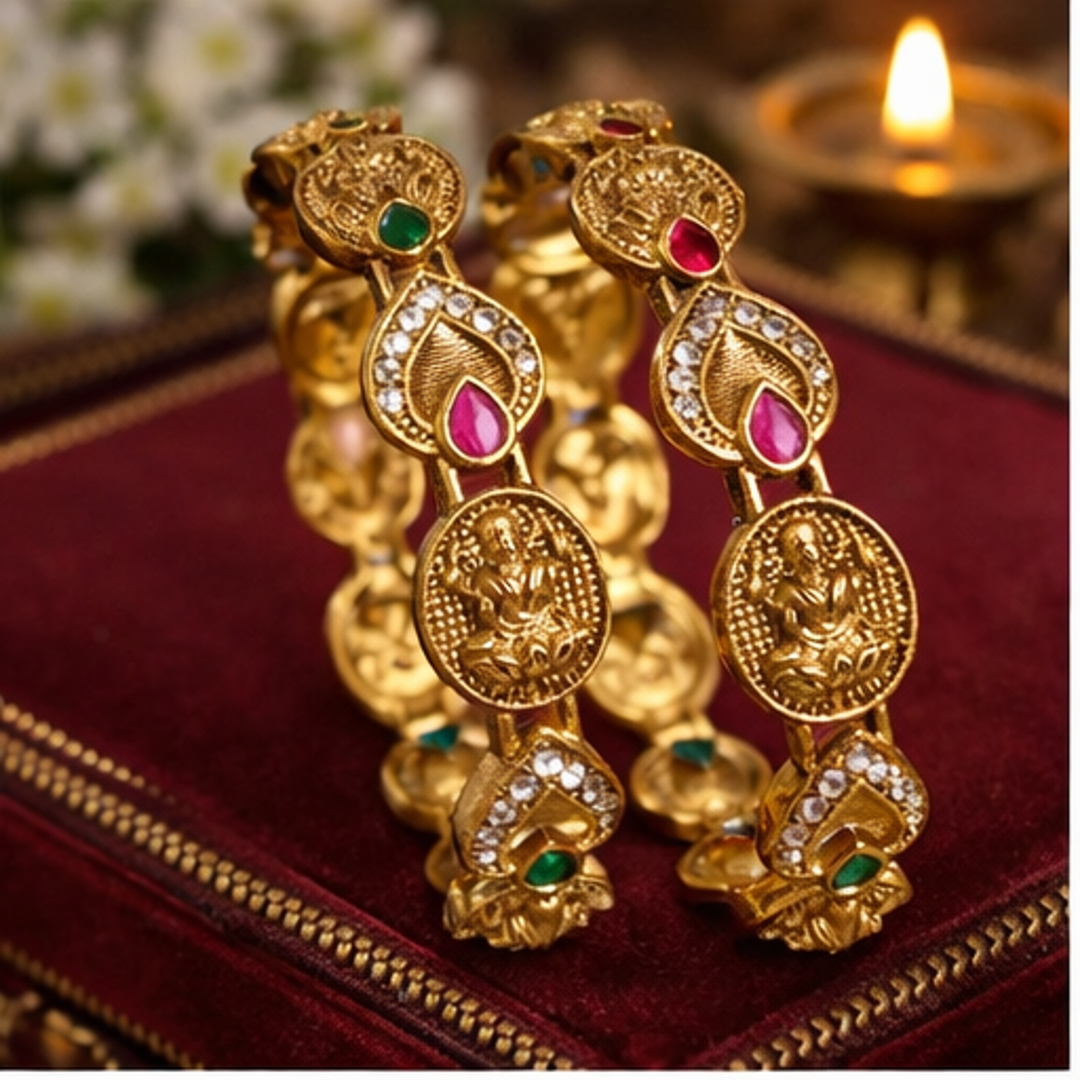 Add a touch of divine elegance to your jewelry collection with these exquisite temple-style designer bangles, crafted in a rich antique gold finish. Each bangle features intricately carved Lakshmi motifs set within detailed oval frames, beautifully accented with sparkling stone borders and vibrant ruby and emerald-toned stones. The combination of traditional craftsmanship and graceful design creates a regal look that is perfect for weddings, festive occasions, and cultural celebrations. Designed to complement sarees, lehengas, and other ethnic ensembles, these bangles make a timeless statement of heritage, prosperity, and refined style.