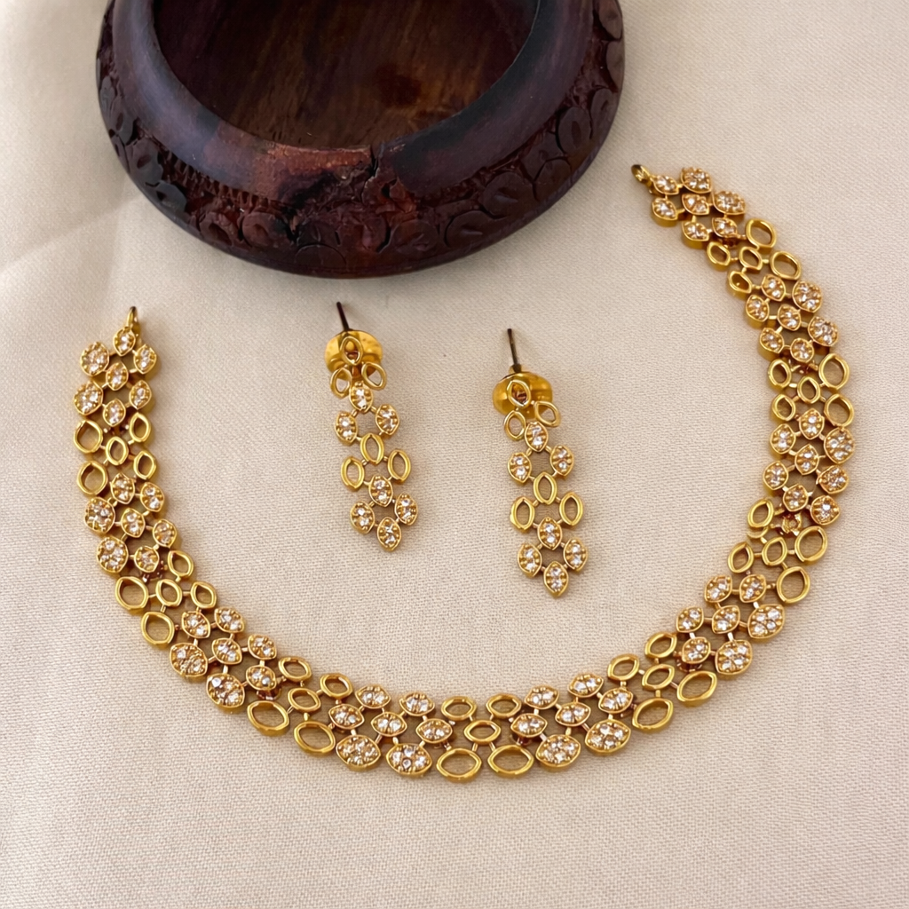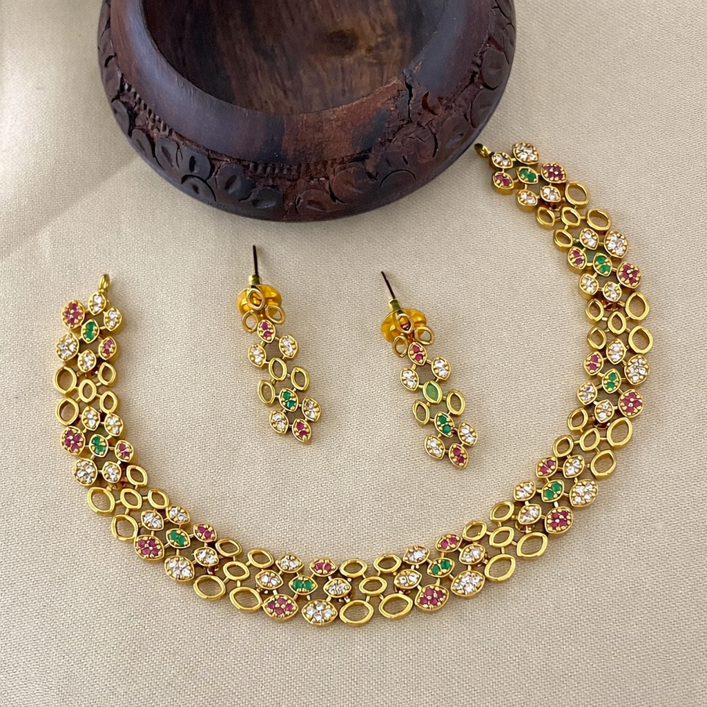 This elegant jewellery paired with matching earrings, the set blends classic charm with modern elegance, making it perfect for weddings, festive occasions, and evening celebrations. Its graceful design highlights sophistication while the deep green stones add a luxurious and timeless appeal.