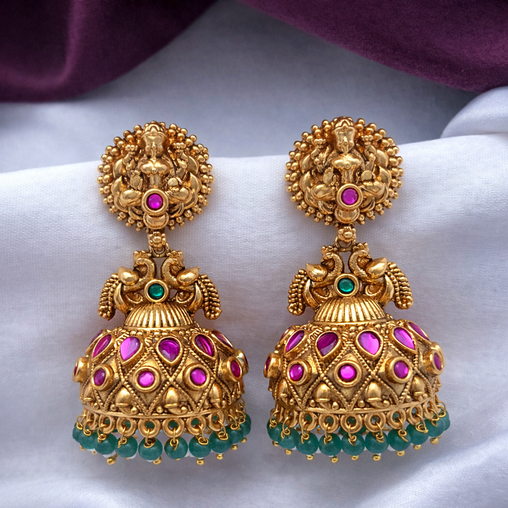 Celebrate timeless elegance with our Syamanthakam Jhumka, a stunning blend of traditional artistry and royal charm. Crafted in a rich gold finish, these earrings feature an intricate peacock-inspired design adorned with vibrant ruby and emerald-toned stones, sparkling white accents, and delicate pearl drops. The beautifully detailed dome-shaped jhumka adds graceful movement and grandeur, making them perfect for weddings, festive occasions, and cultural celebrations. Designed to complement sarees, lehengas, and ethnic ensembles, this exquisite pair brings heritage craftsmanship and modern sophistication together in one statement piece.