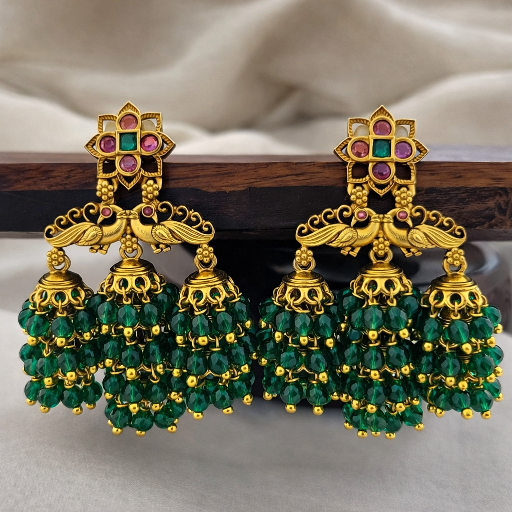 Celebrate timeless elegance with our Syamanthakam Earrings, a stunning blend of traditional artistry and royal charm. Crafted in a rich gold finish, these earrings feature an intricate peacock-inspired design adorned with vibrant ruby and emerald-toned stones, sparkling white accents, and delicate pearl drops. The beautifully detailed dome-shaped earrings adds graceful movement and grandeur, making them perfect for weddings, festive occasions, and cultural celebrations. Designed to complement sarees, lehengas, and ethnic ensembles, this exquisite pair brings heritage craftsmanship and modern sophistication together in one statement piece.