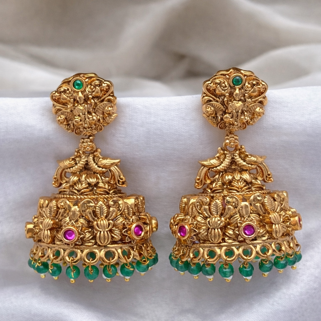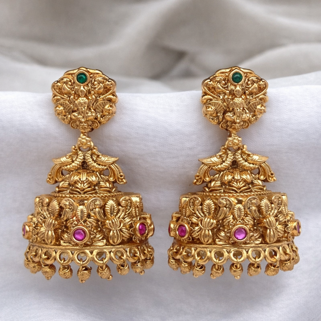 Celebrate timeless elegance with our Syamanthakam Earrings, a stunning blend of traditional artistry and royal charm. Crafted in a rich gold finish, these earrings feature an intricate peacock-inspired design adorned with vibrant ruby and emerald-toned stones, sparkling white accents, and delicate pearl drops. The beautifully detailed dome-shaped earrings adds graceful movement and grandeur, making them perfect for weddings, festive occasions, and cultural celebrations. Designed to complement sarees, lehengas, and ethnic ensembles, this exquisite pair brings heritage craftsmanship and modern sophistication together in one statement piece.
