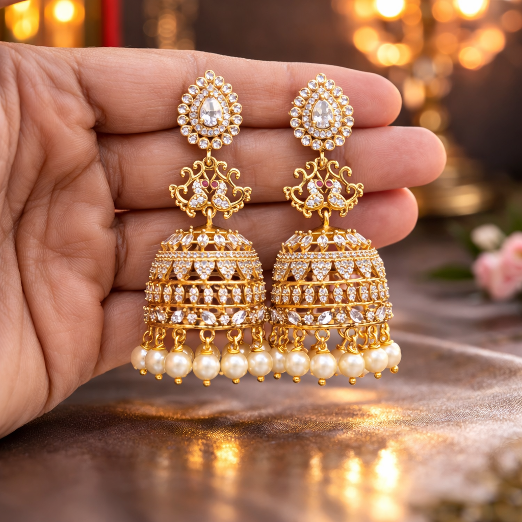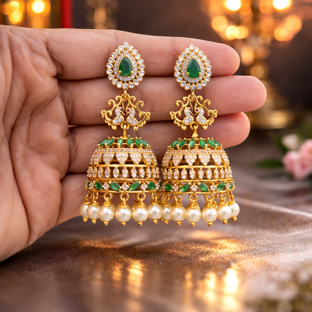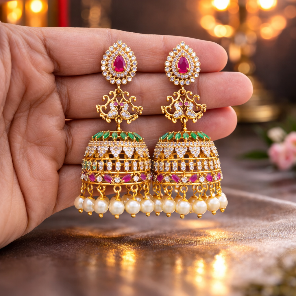 Celebrate timeless elegance with our Syamanthakam Earrings, a stunning blend of traditional artistry and royal charm. Crafted in a rich gold finish, these earrings feature an intricate peacock-inspired design adorned with vibrant ruby and emerald-toned stones, sparkling white accents, and delicate pearl drops. The beautifully detailed dome-shaped earrings adds graceful movement and grandeur, making them perfect for weddings, festive occasions, and cultural celebrations. Designed to complement sarees, lehengas, and ethnic ensembles, this exquisite pair brings heritage craftsmanship and modern sophistication together in one statement piece.