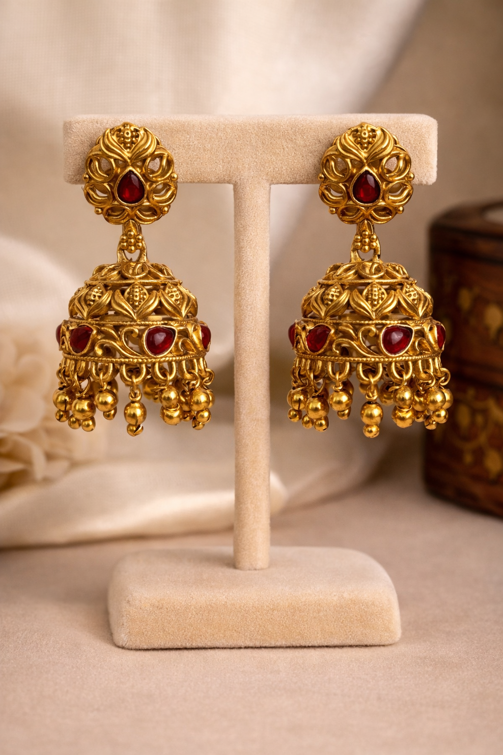 Celebrate timeless elegance with our Syamanthakam Earrings, a stunning blend of traditional artistry and royal charm. Crafted in a rich gold finish, these earrings feature an intricate peacock-inspired design adorned with vibrant ruby and emerald-toned stones, sparkling white accents, and delicate pearl drops. The beautifully detailed dome-shaped earrings adds graceful movement and grandeur, making them perfect for weddings, festive occasions, and cultural celebrations. Designed to complement sarees, lehengas, and ethnic ensembles, this exquisite pair brings heritage craftsmanship and modern sophistication together in one statement piece.