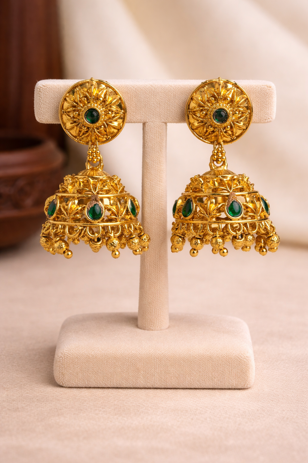 Celebrate timeless elegance with our Syamanthakam Earrings, a stunning blend of traditional artistry and royal charm. Crafted in a rich gold finish, these earrings feature an intricate peacock-inspired design adorned with vibrant ruby and emerald-toned stones, sparkling white accents, and delicate pearl drops. The beautifully detailed dome-shaped earrings adds graceful movement and grandeur, making them perfect for weddings, festive occasions, and cultural celebrations. Designed to complement sarees, lehengas, and ethnic ensembles, this exquisite pair brings heritage craftsmanship and modern sophistication together in one statement piece.