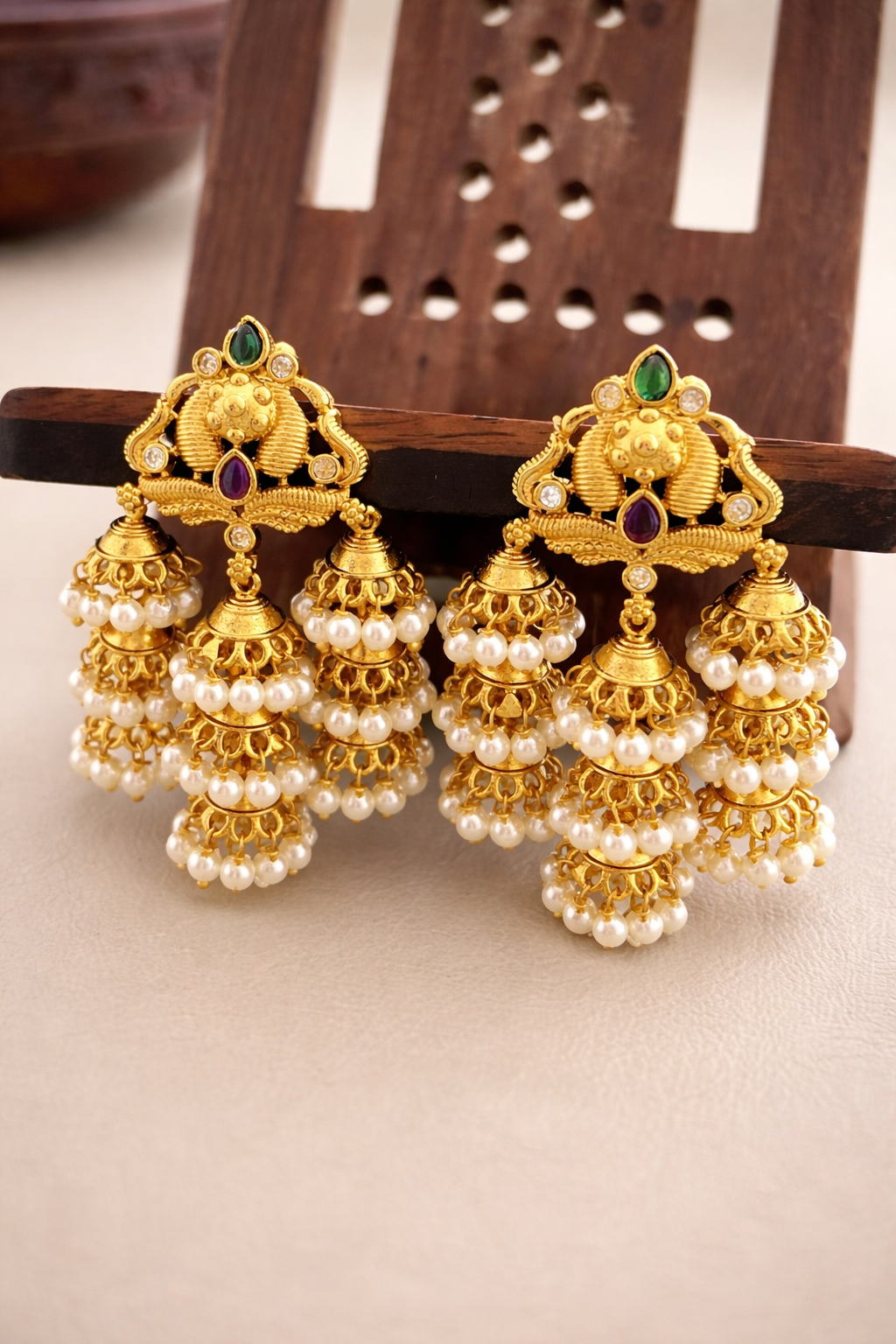 Celebrate timeless elegance with our Syamanthakam Earrings, a stunning blend of traditional artistry and royal charm. Crafted in a rich gold finish, these earrings feature an intricate peacock-inspired design adorned with vibrant ruby and emerald-toned stones, sparkling white accents, and delicate pearl drops. The beautifully detailed dome-shaped earrings adds graceful movement and grandeur, making them perfect for weddings, festive occasions, and cultural celebrations. Designed to complement sarees, lehengas, and ethnic ensembles, this exquisite pair brings heritage craftsmanship and modern sophistication together in one statement piece.