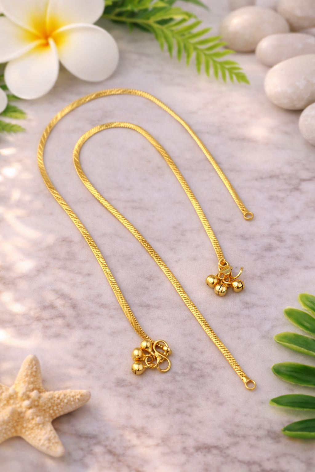 Elegant and minimal, this gold imitation designer anklet features delicate dangling beads that create a graceful traditional look. Lightweight and stylish, it adds a subtle charm to both ethnic and festive outfits. Perfect for daily wear, functions, and special occasions.
