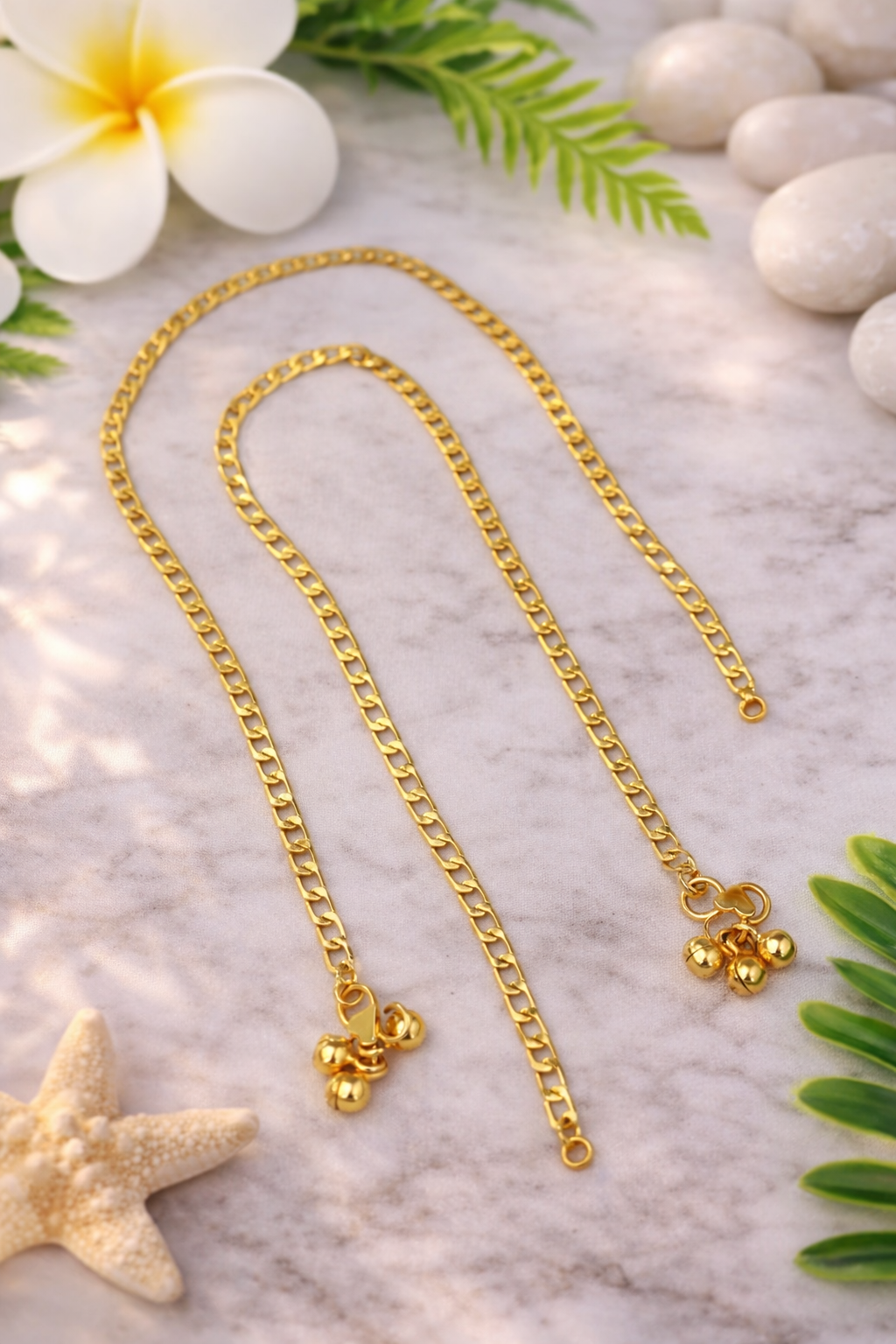 Elegant and minimal, this gold imitation designer anklet features delicate dangling beads that create a graceful traditional look. Lightweight and stylish, it adds a subtle charm to both ethnic and festive outfits. Perfect for daily wear, functions, and special occasions.