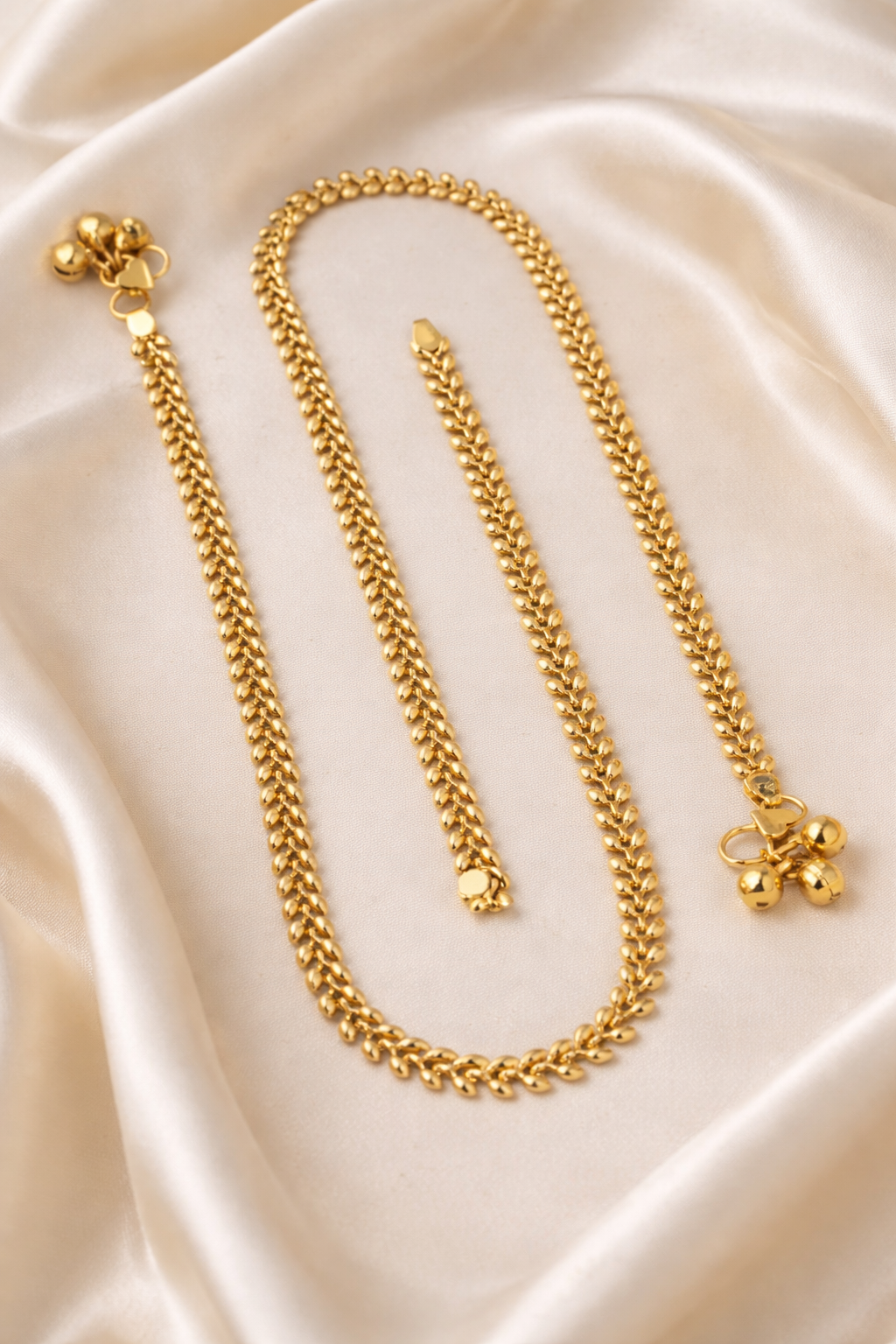 Elegant and minimal, this gold imitation designer anklet features delicate dangling beads that create a graceful traditional look. Lightweight and stylish, it adds a subtle charm to both ethnic and festive outfits. Perfect for daily wear, functions, and special occasions.