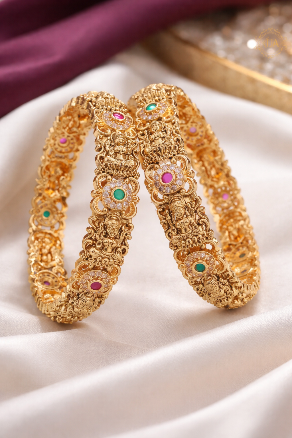 These elegant gold bangles feature a beautifully woven teardrop-link design, delicately set with shimmering white stones and accented with rich ruby and emerald tones. The alternating gemstone pattern enhances the brilliance of the polished gold finish, creating a radiant and refined look. Lightweight yet striking, these bangles are perfect for festive occasions, weddings, and traditional celebrations. Their versatile color combination allows them to complement both classic and contemporary outfits, making them a timeless addition to any jewelry collection.