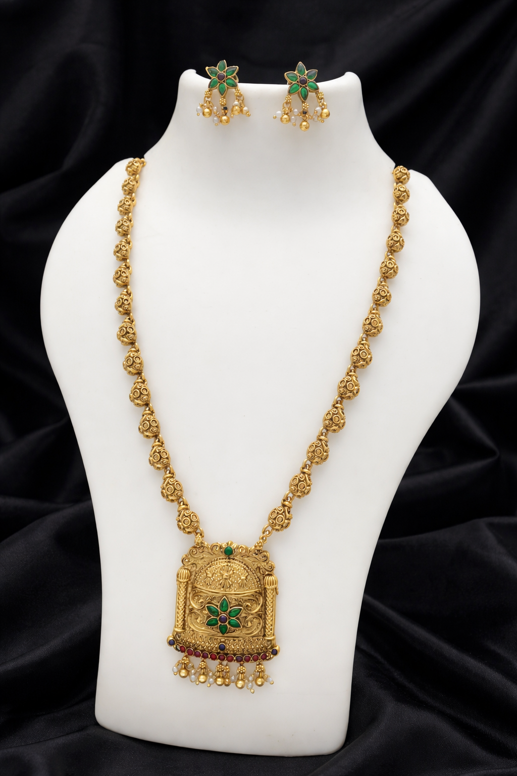 Paired with matching drop earrings, the set blends classic charm with modern elegance, making it perfect for weddings, festive occasions, and evening celebrations. Its graceful design highlights sophistication while the deep green stones add a luxurious and timeless appeal.