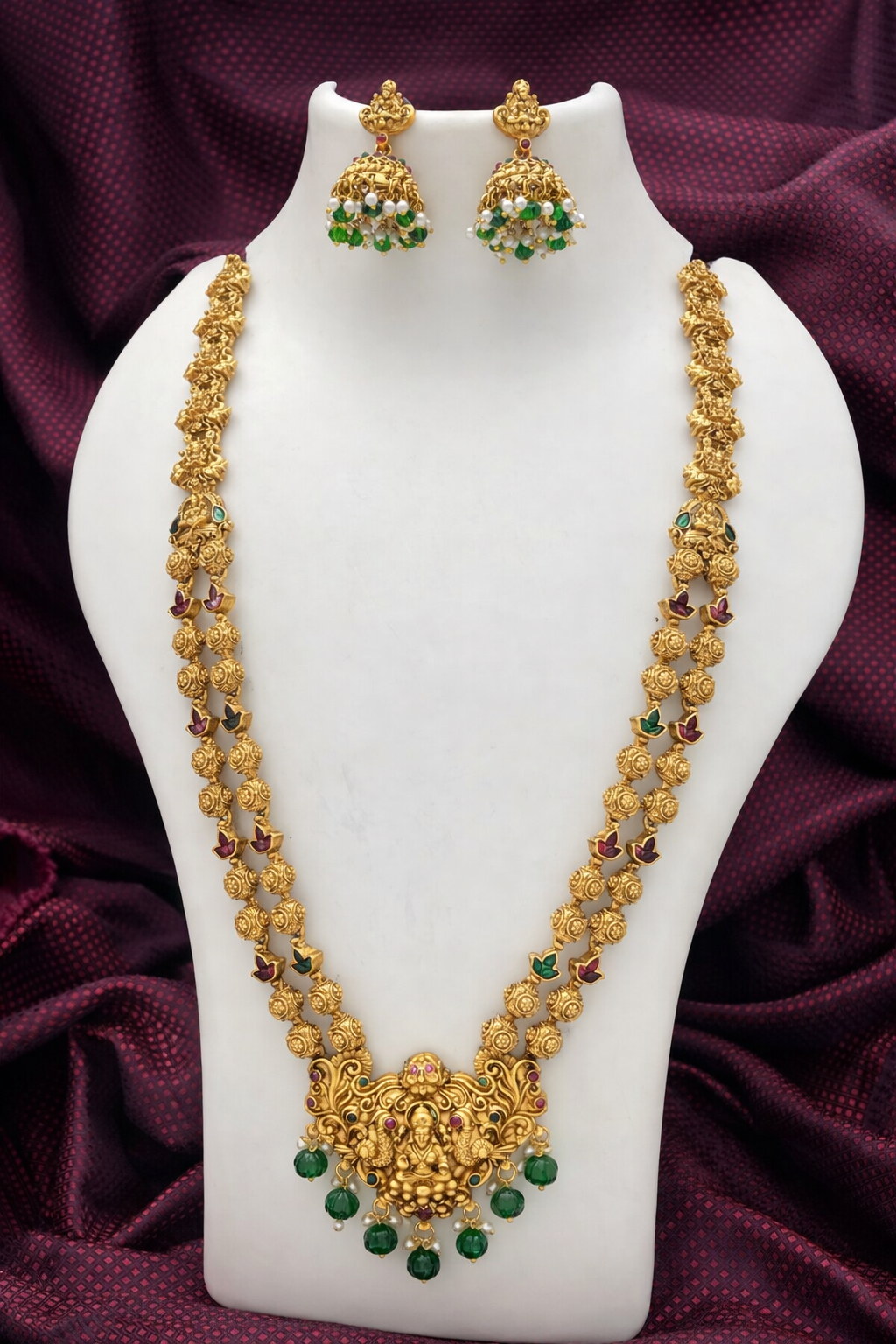 Paired with matching drop earrings, the set blends classic charm with modern elegance, making it perfect for weddings, festive occasions, and evening celebrations. Its graceful design highlights sophistication while the deep green stones add a luxurious and timeless appeal.