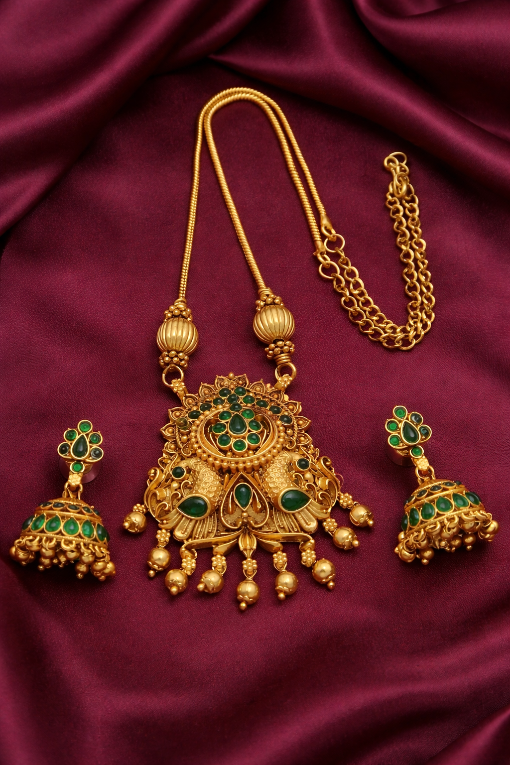 This elegant jewellery paired with matching drop earrings, the set blends classic charm with modern elegance, making it perfect for weddings, festive occasions, and evening celebrations. Its graceful design highlights sophistication while the deep green stones add a luxurious and timeless appeal.